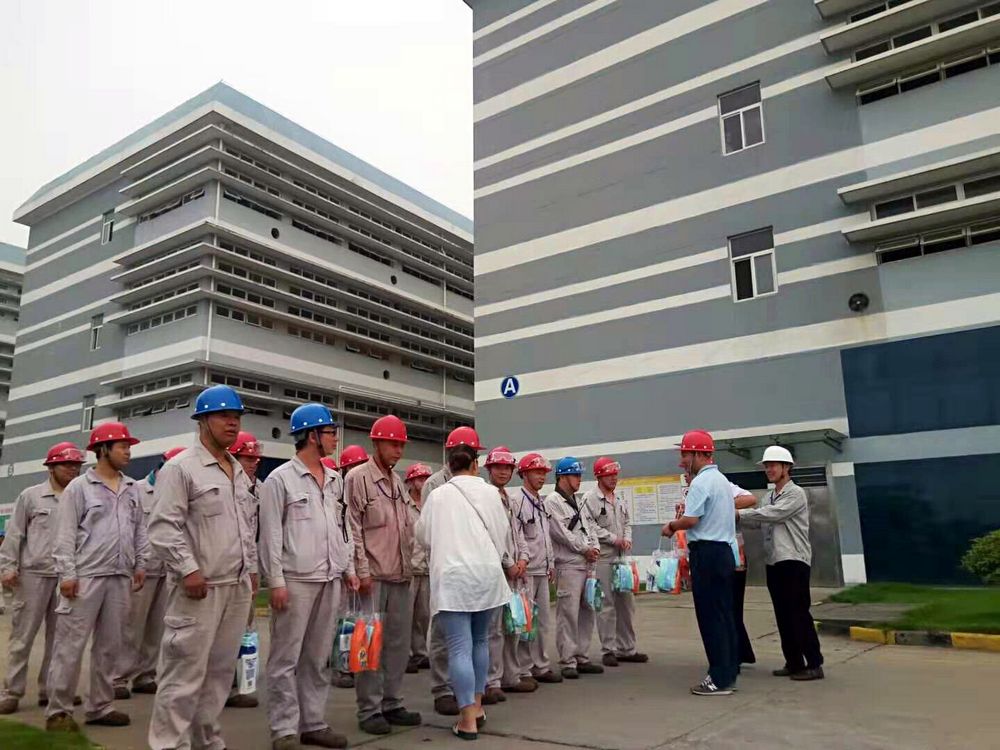 上午8點(diǎn)50分,一線員工代表在班長的指揮下,快速來到廠區(qū)指定地點(diǎn),列隊(duì)排開,精神抖擻,歡迎園區(qū)總工會的到來。園區(qū)領(lǐng)導(dǎo)們?yōu)榇蠹宜蛠砹讼醋o(hù)套裝、毛巾、風(fēng)油精、花露水等夏季清涼用品,與一線員工親切握手并將清涼用品一一送交大家手中,囑咐大家注意防暑降溫,并希望企業(yè)合理安排好員工的作息,抓好安全生產(chǎn)工作。